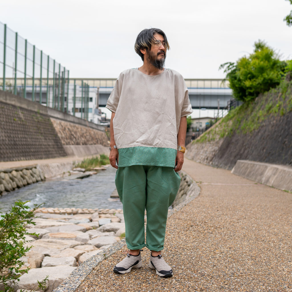 股上も通常のパンツに比べて深めに取ることで、お腹周りの大小に柔軟に対応出来、かつ小柄な方も大柄の方も履くと足元へ向かうラインがスッキリと見えるように、腿のボリュームとの緩急さをつけて仕上げています。