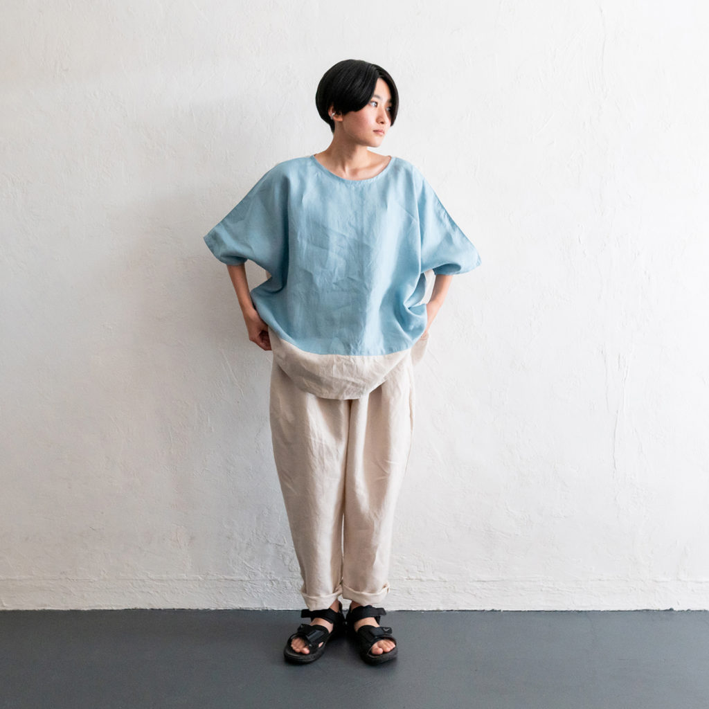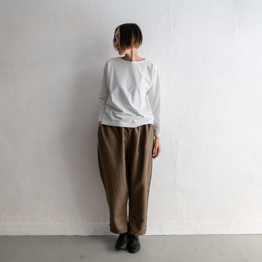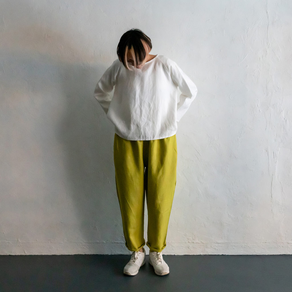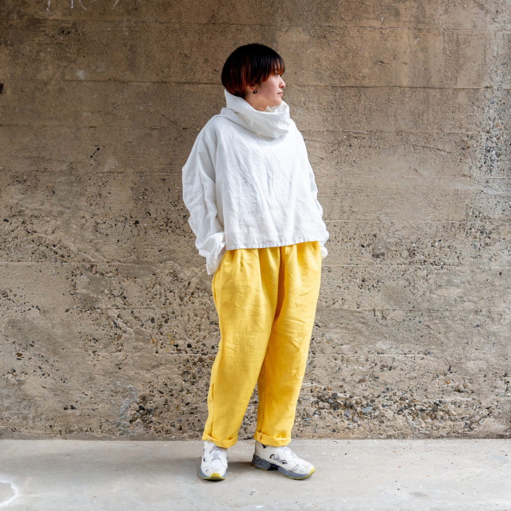 短めのトップスと合わせて、このパンツの最大限のデザインを活かす着こなしも、ワンピースやロングスモックの下に履いてもスッキリみえるように、合わせるアイテムで変化を楽しんでもらえます。